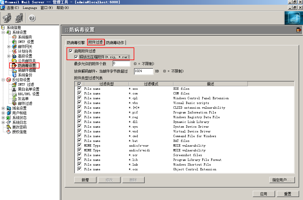 Winmail 也支持附件类型过滤,可以过滤邮件中含中指定特征的附件和允许邮件中的附件数。