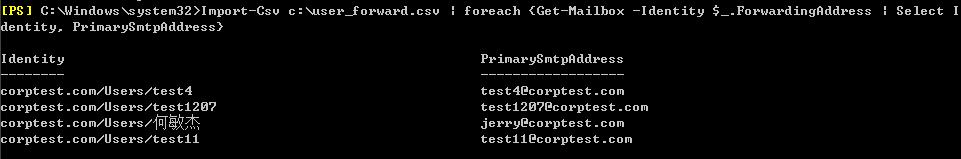 4.再利用Import-Csv命令,导入刚才导出的csv文件,同时查找转发目标邮箱所对应的邮件地址