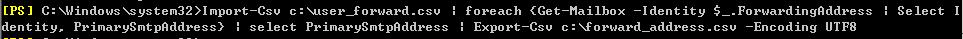 Import-Csv c:\user_forward.csv | foreach {Get-Mailbox -Identity $_.ForwardingAddress | Select Identity, PrimarySmtpAddress} | select PrimarySmtpAddress | Export-Csv c:\forward_address.csv -Encoding UTF8