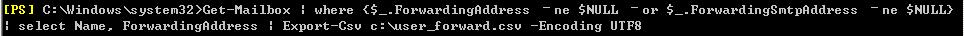 Get-Mailbox | where {$_.ForwardingAddress –ne $NULL –or $_.ForwardingSmtpAddress –ne $NULL} | select Name, ForwardingAddress | Export-Csv c:\user_forward.csv -Encoding UTF8