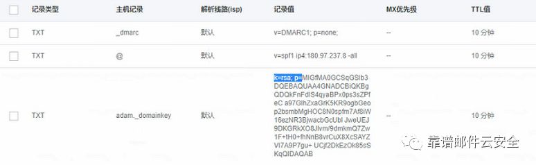 3、、三级域名(用于DKIM验证,如上,开头编码需带上k=rsa; p=上面的编码复制过来,你也可以写成v=DKIM1; p=..)