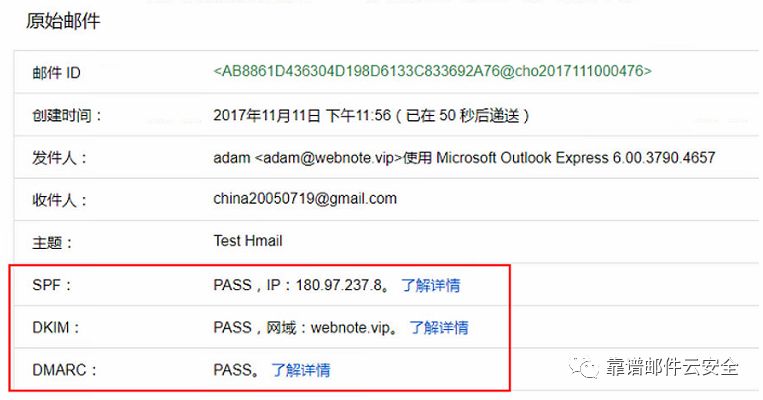 往Gmail发往测试邮件,查看邮件头信息,如下,验证通过。