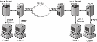 从表面上看,一封邮件是从发件人的机器直接传送到收件人的机器,但通常这并不正确,一封邮件发送和接受过程要经过四台计算机。参考下图所示。用户通常在自己的电脑前编写阅读邮件,我们把它叫做客户端 (client 1~~4 )。大部分组织里,都是用一台专门的机器处理邮件,称作邮件服务器 (SMTP1, SMTP2). 如果用户是从家里拨号上网,那末邮件服务器是ISP 提供的。