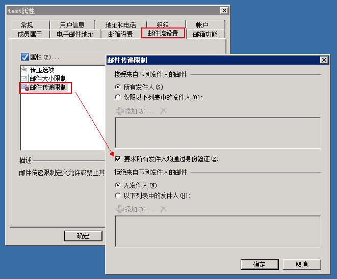 3.在弹出的“邮件传递限制”窗口中选中“要求所有发件人均通过身份验证”,单击“确定”。