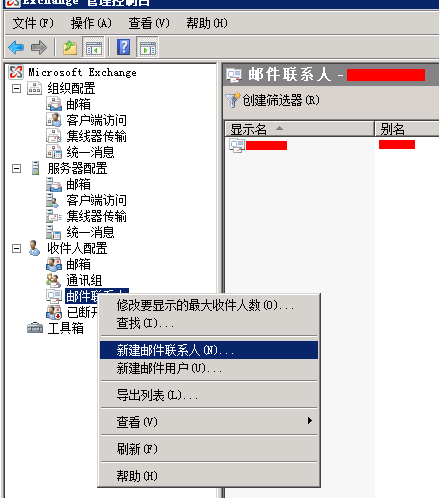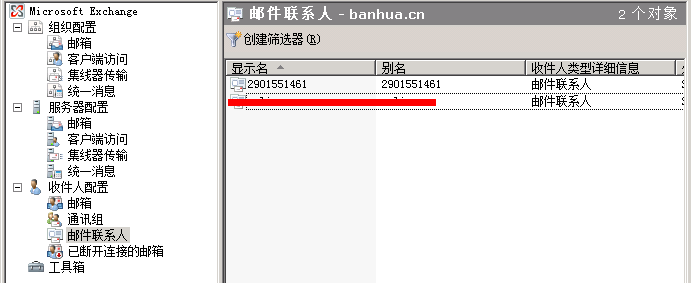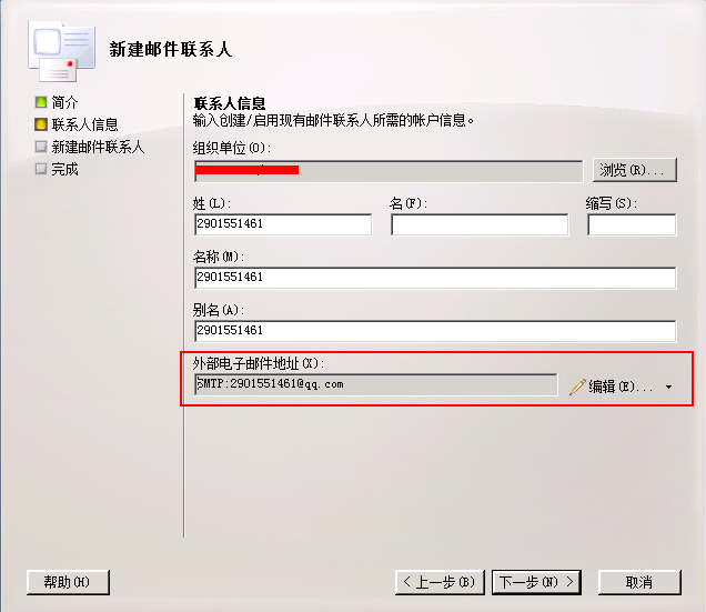 首先我们需要在内部邮件系统为外网的邮箱 2901551461@qq.com 增加一个联系人账户。如图所示:
