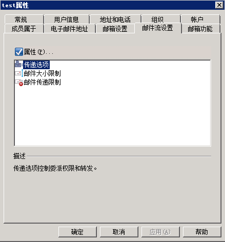 然后我们需要修改Test邮箱的邮件流设置,首先找到Test这个账户,然后选择属性,并切换到邮件流设置选项卡,选择【传递选项】,并点击【属性】,如图所示: