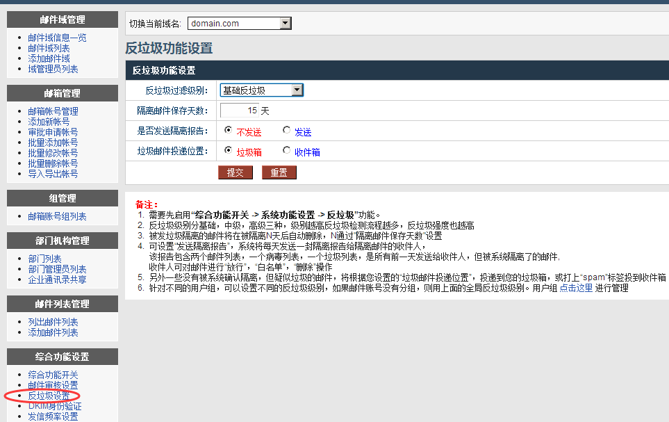 2、再设置反垃圾,“域/超域管理后台 --- 综合功能开关 --- 反垃圾设置 --- 反垃圾功能设置”