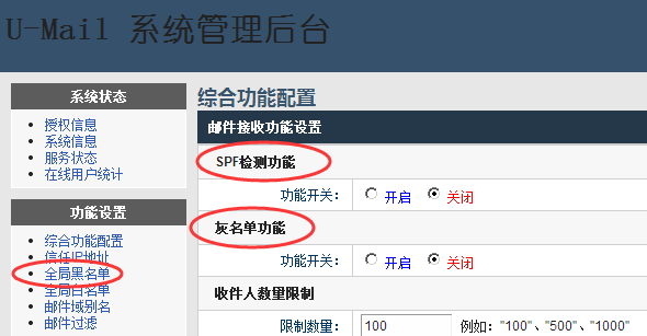 3、也可以开启“系统管理后台 --- 综合功能设置”的SPF检测、灰名单,或设置全局黑名单。(不过一般不用启用或设置这些,因为第2步中设置后垃圾邮件过滤效果就非常好了)