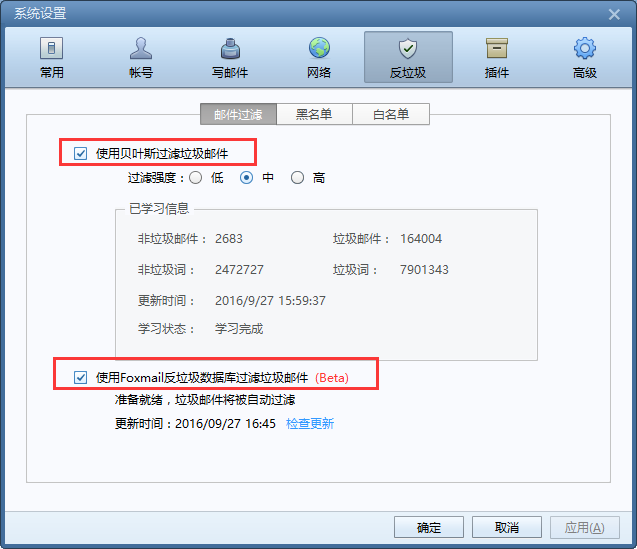 注:贝叶斯过滤安装好Foxmail是自动开启的,但Foxmail反垃圾数据库则需要自己手动启用。