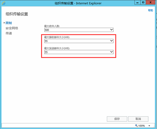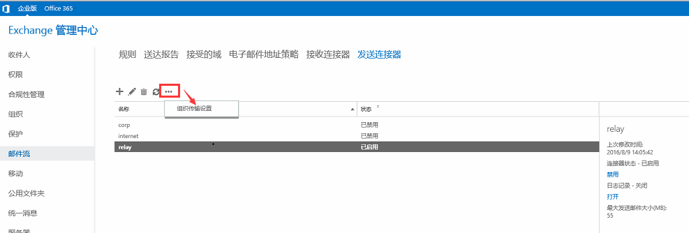 登陆Ex2013的ECP,在【邮件流】里面任意点击【接收连接器】【发送连接器】,如下图,将鼠标移动至 【更多】即三个小点的位置出现组织传输设置,点击进入设置界面。