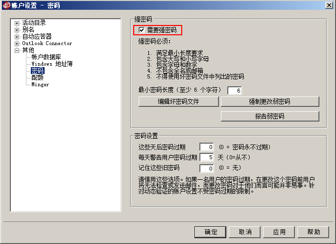 备注: 可以通过编辑MDaemon.ini文件中的以下字段来设置密码的长度 [Special] MinPasswordLength=XX (default 6)