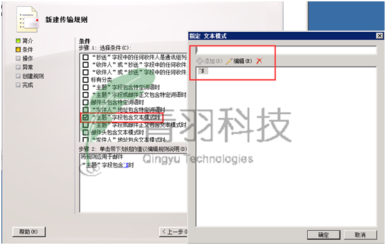 2. 在条件中,步骤1,选择条件:勾选“‘主题’字段与文本模式匹配时”;步骤2:单击带有蓝色下划线的“文本模式”,输入“^$”,然后单击“添加”,单击“确定”关闭对话框,下一步: