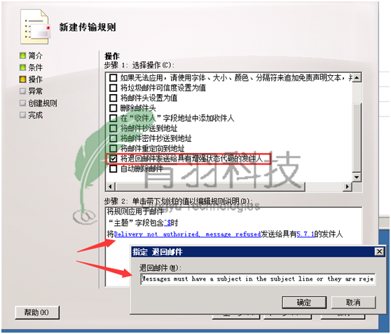 3. 在操作中,步骤1,选择操作:勾选“将拒绝的邮件发送给具有增强状态代码的发件人”;步骤2:单击带有蓝色下划线的“拒绝的邮件”键入(必须键入英文字段):Messages must have a subject in the subject line or they are rejected.点击确定: