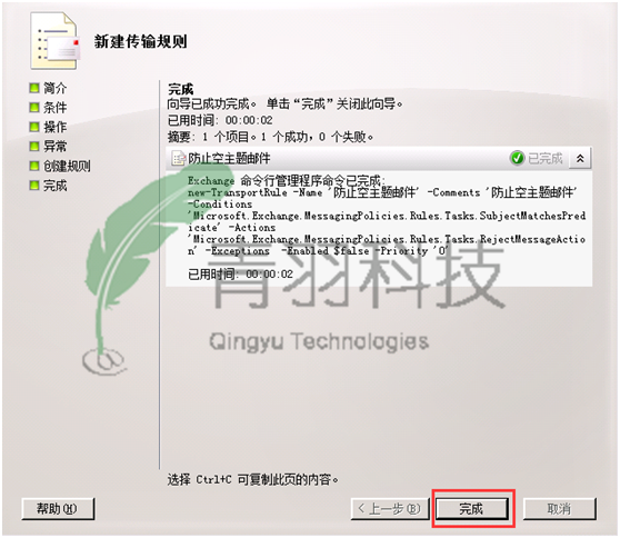4.至此完成了禁止空主题邮件传输规则的配置。