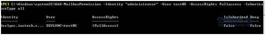Add-MailboxPermission -Identity "administrator" -User lchen -AccessRights Fullaccess -InheritanceType all