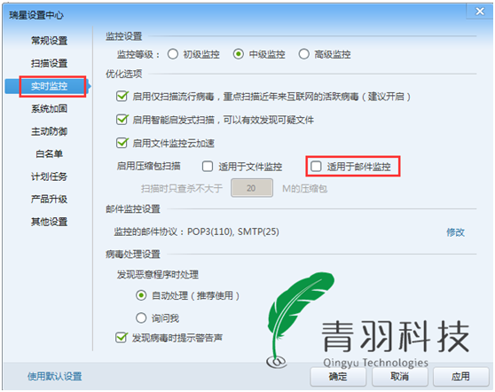 如果安装了瑞星杀毒软件,出现客户端软件不能收发邮件的现象,这是因为瑞星提供了对邮件的实时监控功能,有可能会影响到客户端软件对邮件的正常收发。为了解决此问题,只需要在瑞星杀毒软件的“瑞星设置中心”——“ 实时监控”中,去掉“适用于邮件监控”前面的对勾即可。