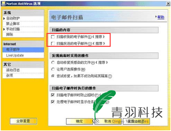 在诺顿杀毒软件的选项->电子邮件->去掉”扫描收到的电子邮件”、”扫描发送的电子邮件”前面的勾。”