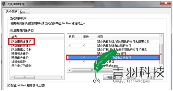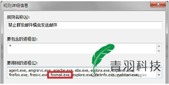 4、如果不想取消阻挡栏中的勾选,可以点击“访问保护属性”图中的“编辑”按钮,将邮件客户端的进程名加入规则中的“要排除的进程”栏中。 如果使用的是Foxmail客户端软件,则添加foxmail.exe