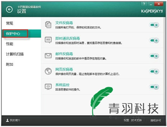 1、打开卡巴斯基主窗口,点击“设置”——“保护中心”