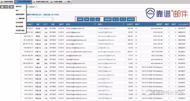 当然,如果IT对此不是很精通,也没关系。我们靠谱邮件为企业提供的云安全网关服务,里面包含了 IT能自主查询和使用的日志管理平台,里面有通过我们云网关产生的日志流水表格,简单明了,邮件收发成功或失败,以及失败的原因都一目了然,是IT靠谱的帮手。