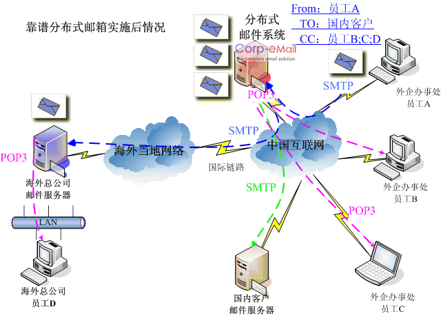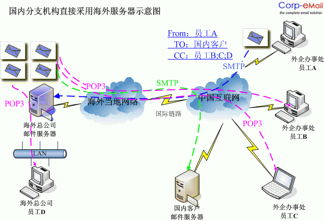 邮件发送过程:员工A利用办公室宽带接入中国电信通过国际链路传递至海外公司邮件服务器(图中蓝线),海外公司邮件服务器分发邮件为4封,其中BCD邮箱各1封,另外1封Copy通过国际链路传送至国内邮件服务器(图中绿线)。B,C,D透过利用POP3(图中红线)收取了各自的邮件。