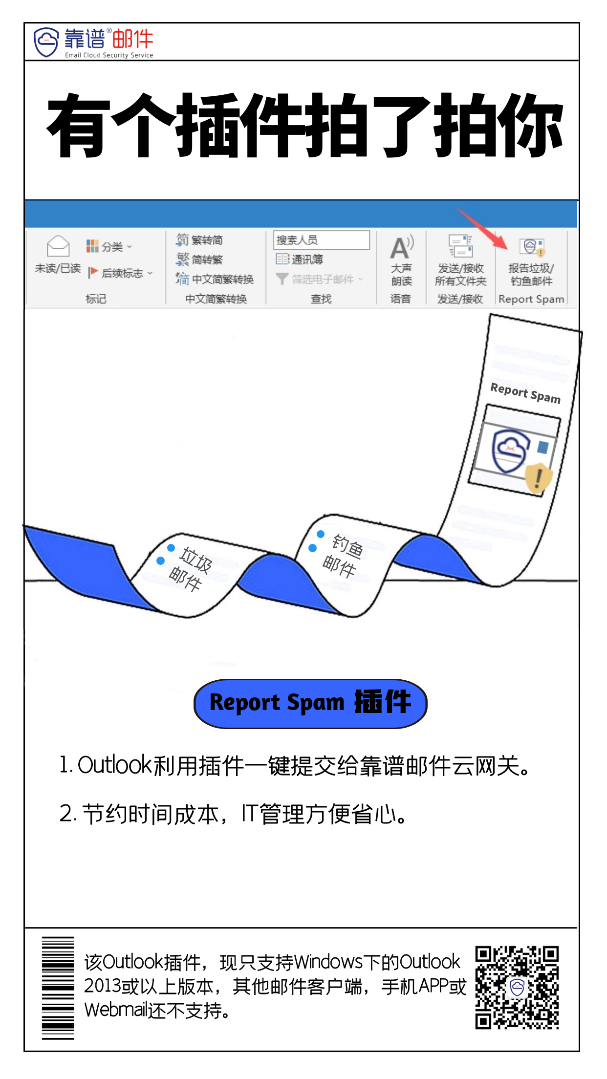 靠谱®邮件开发了一款名为“Report Spam“的Outlook插件,员工在收到可疑的垃圾,钓鱼或病毒等邮件后,可以利用该插件一键提交给靠谱®邮件云网关,包括邮件头及邮件正文等信息,给我们分析可疑邮件样本并制定此类邮件的阻挡策略带来了便利。