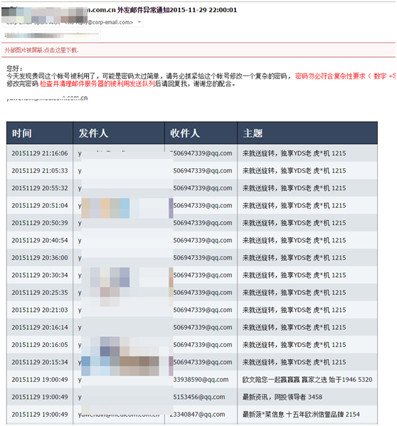 9.如果确认被利用垃圾邮件,可以一键加入邮件服务器阻止和拒收策略,用户会收到退信,等用户修改账号密码后放开