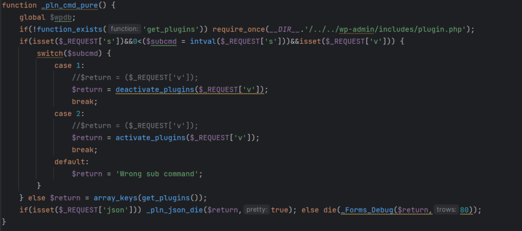 插件控制:恶意软件操作员可以远程激活或停用被入侵网站上的任意WordPress插件。不仅如此,恶意软件还会清除网站数据库中的痕迹。