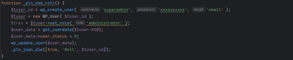 创建用户:创建一个名为 "superadmin "的用户,该用户拥有硬编码密码和管理员级权限,第二个功能是删除该用户以清除感染痕迹。