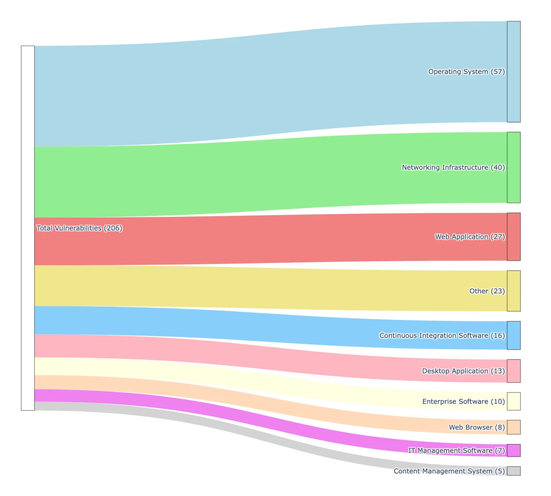 大约206个漏洞具有可用的武器化利用代码,这意味着如果使用它们,它们很可能会危害目标系统。有115个漏洞经常被威胁者、恶意软件和勒索软件组织(例如 Clop)利用。