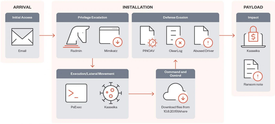 在所研究的案例中,Kasseika 使用鱼叉式网络钓鱼最初访问并收集目标公司一名员工的凭据。然后,该团队使用远程管理工具来获得特权访问权限并在目标网络中移动。