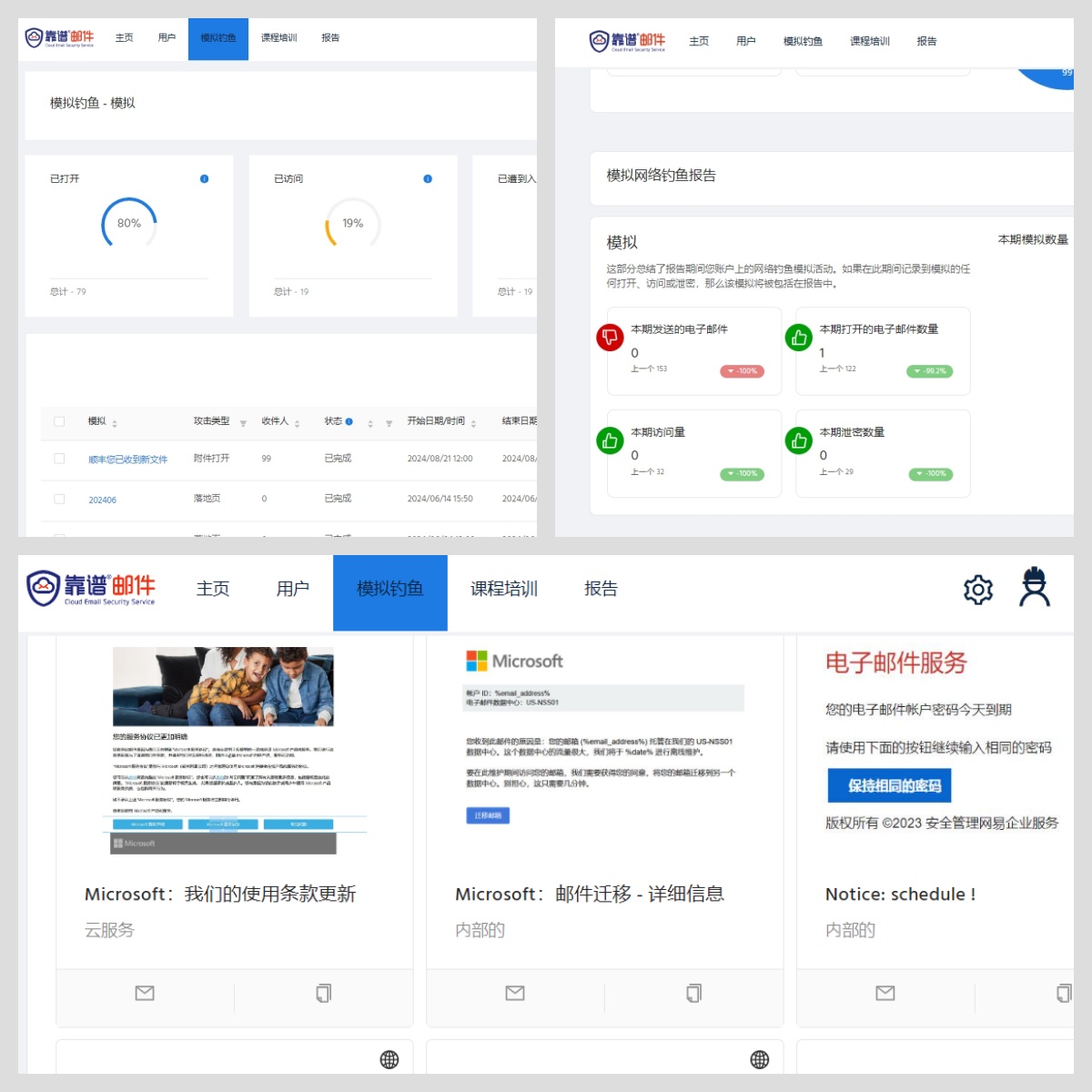 钓鱼邮件演练服务:通过靠谱邮件安全意识培训平台开箱即用的钓鱼邮件模板,全方位模拟钓鱼攻击,帮助企业快速完成员工安全意识水平的垂直检查,大幅提升了员工面对钓鱼邮件的警觉性和应对能力。