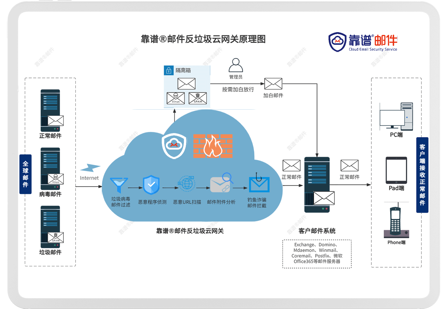 邮件云网关服务:通过智能过滤技术,阻挡了垃圾邮件、钓鱼邮件的入侵,邮件容灾备份不丢失。