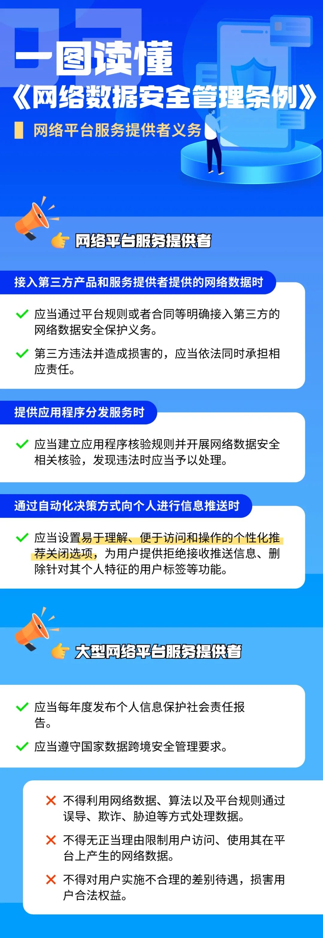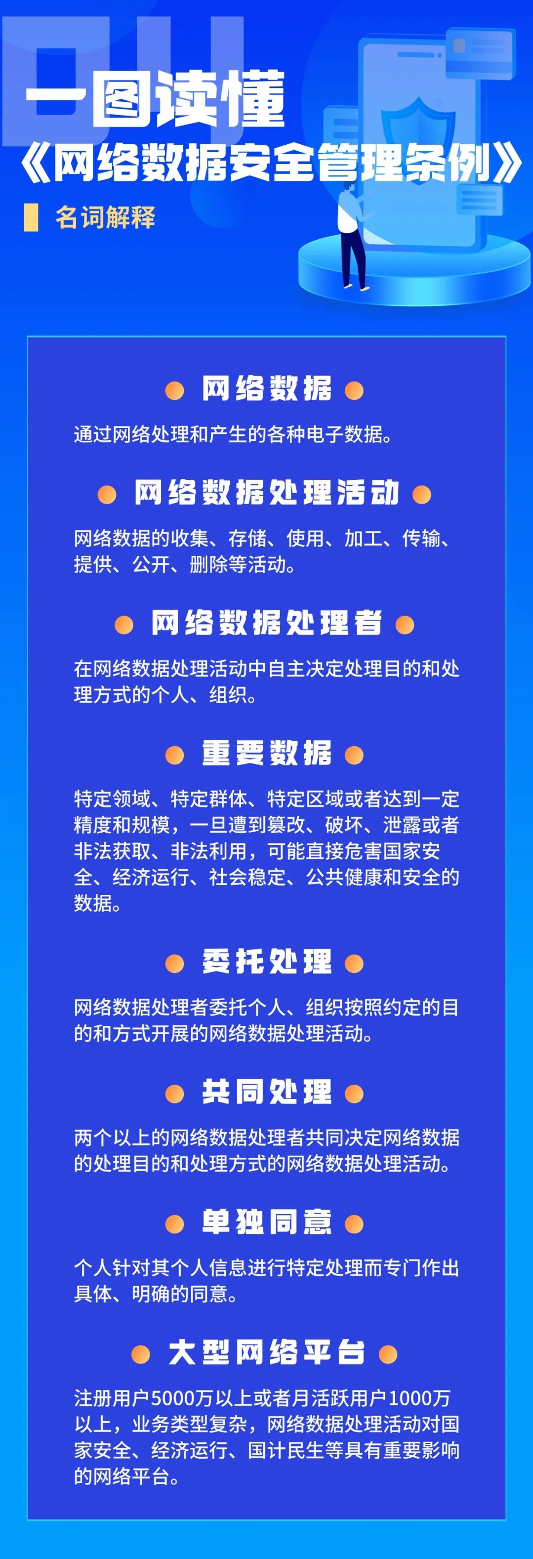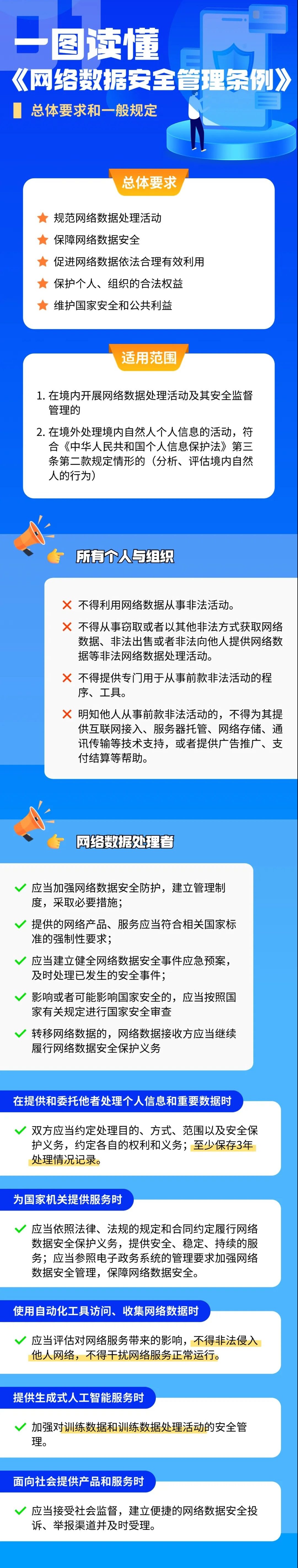 《条例》共9章64条,以《中华人民共和国网络安全法》《中华人民共和国数据安全法》《中华人民共和国个人信息保护法》作为上位法,总结了相关部门规章制度的实施经验,蕴含了大量值得网络及数据产业从事者关注的最新规定。以图解的形式带您导读《条例》的关键重点。