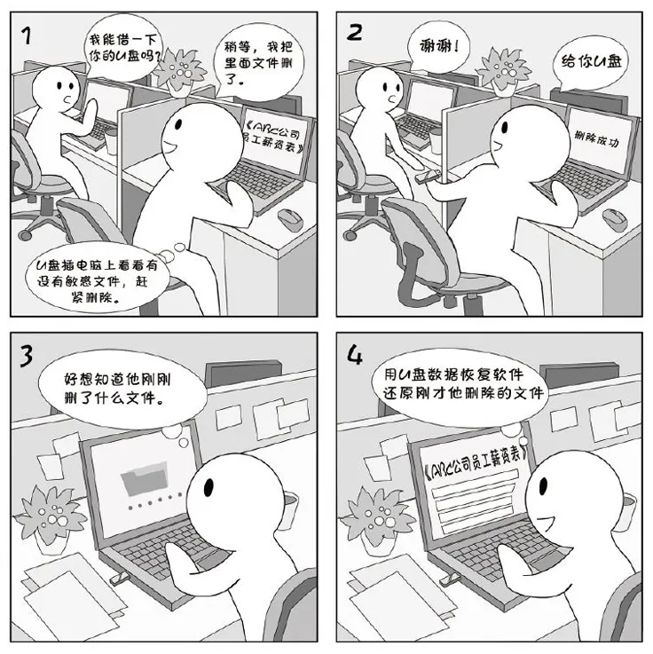 删除电脑或U盘中的文件时,如果仅点删除按钮,或快速格式化,其实并未真正从硬盘或U盘中删除,利用数据恢复软件可以轻松恢复出来,清空回收站同样可以恢复。