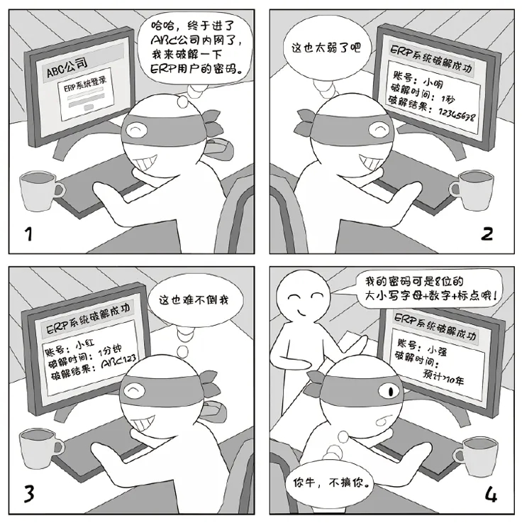 密码越复杂,破解难度越高,而且这个比例是成指数级的,简单6位数数字密码秒破,而8位复杂密码的破解需要20年以上。