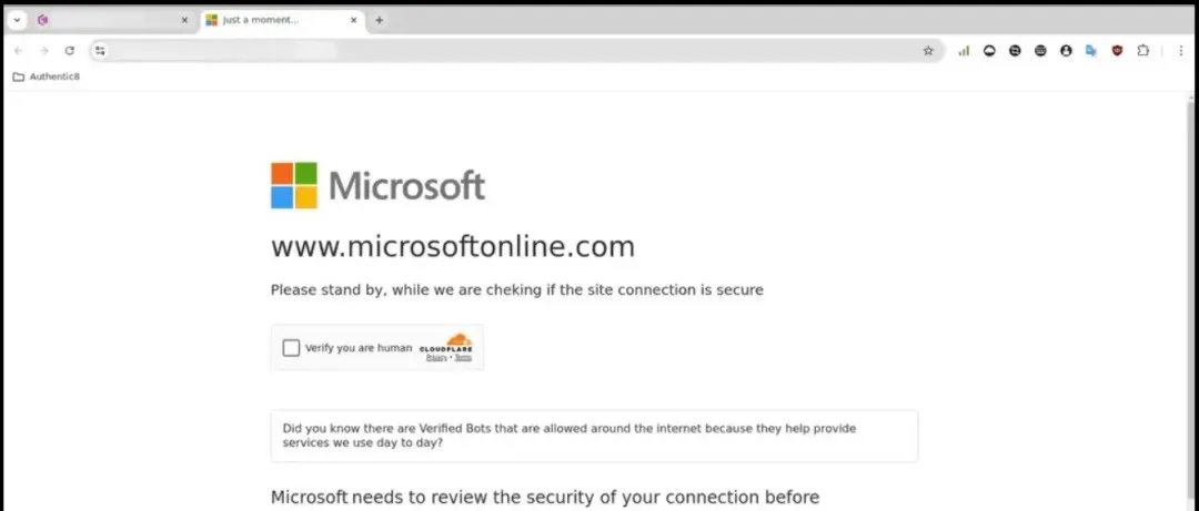 点击按钮后,受害者会被引导至一个带有微软品牌标识的中介页面,该页面受到Cloudflare Turnstile(一种无需验证码的机器人检测机制)保护。这一设计具有双重目的:既防止自动化安全工具分析恶意内容,又同时增强页面的可信度。