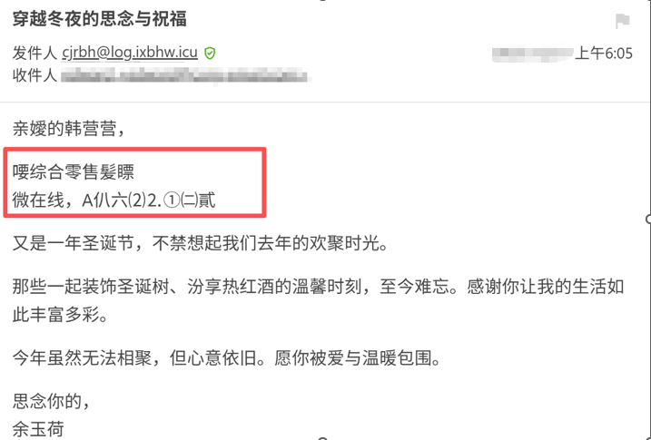 近日,我们安全团队报告发现一种新型钓鱼邮件攻击手法:攻击者在邮件正文中插入看似无害的乱码文字(如"哽综合零售髮暻 微在线,A仆六(2)2.①(=)贰"),表面毫无技术威胁,实则暗藏杀机。这类邮件以节日祝福为伪装,已在全球范围内造成多起企业数据泄露事件。