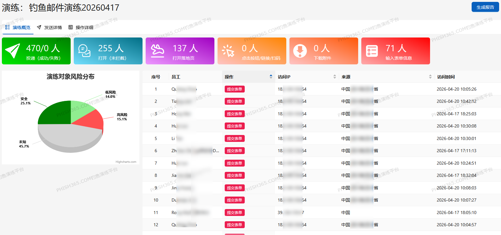 其中,打开钓鱼邮件的人数为 255 人,成功进入钓鱼落地页的人数为 137 人,提交表单信息的人数为 71 人。具体演练数据如下: