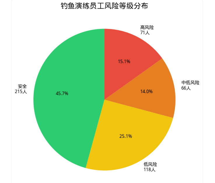 从员工安全风险等级分布来看,该企业超过一半的员工缺乏识别钓鱼邮件的能力,员工安全意识亟需提升。在风险人群中,研发人员和财务人员对技术性钓鱼邮件的警惕性明显不足,更易成为钓鱼攻击的重点目标。