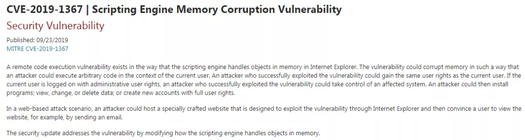 根据微软发布的安全公告,引发此漏洞的根本原因是脚本引擎(Scripting Engine)在内存中处理对象的方式。具体来说就是,Internet Explorer 中的脚本引擎在内存中处理对象时存在一个远程代码执行漏洞,该漏洞以这种方式来破坏内存,然后攻击者可以在当前用户的上下文中执行任意代码。