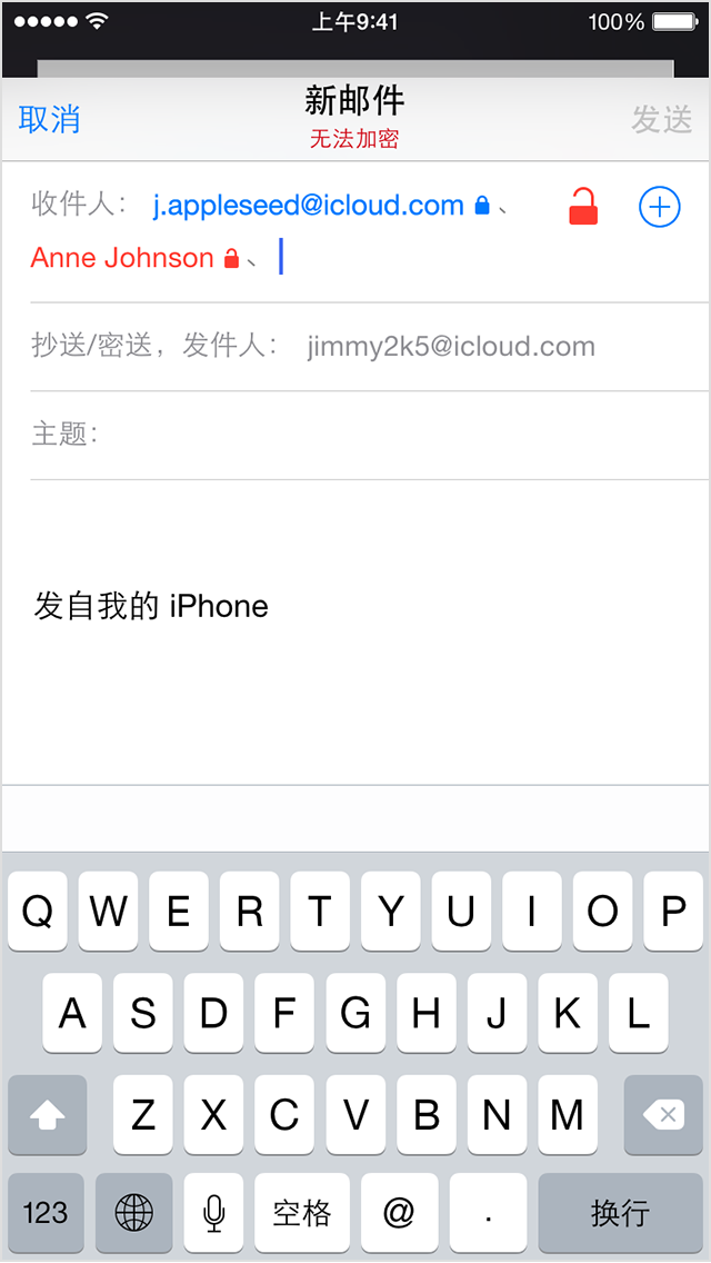如果您添加了收件人而“邮件”无法找到相应证书,则该地址会以红色高亮显示,且收件人的地址右侧会显示一个打开的锁图标。邮件标示现在会显示已解锁和“无法加密”。