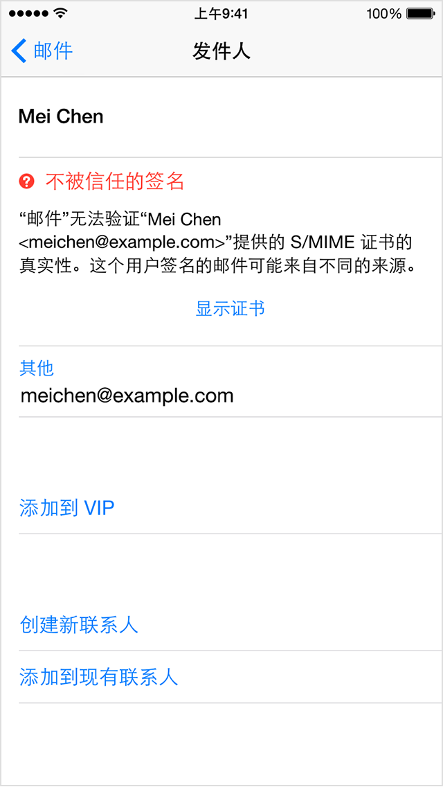 在目标收件人的签名邮件中,轻按发件人的地址。无效的签名会在发件人地址右侧显示一个红色问号 。“邮件”通过发件人地址右侧的蓝色勾号 标出有效的签名。
