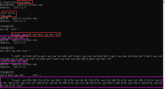 正确格式举例,这里经过DOS查询来看一个正确的设置,一个错误的设置。先看QQ邮箱的,QQ邮箱由于IP众多,设置了几层递归,每条递归里面都保证是只存在一条v的记录: