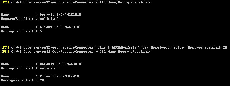 [PS] C:\Windows\system32>Set-ReceiveConnector -identity "Client EXCHANGE2010" -MessageRateLimit 20