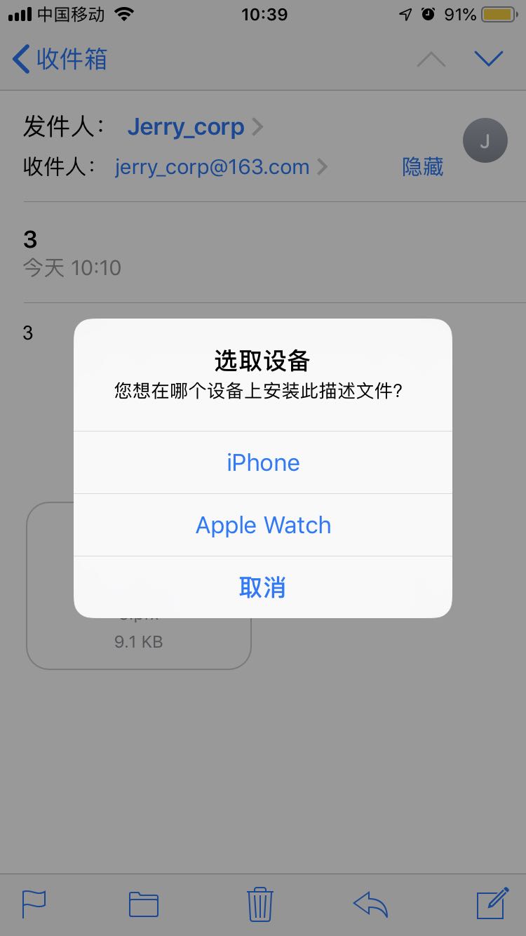 然后把这个pfx格式证书文件以附件形式进行邮件发送,用iPhone手机自带邮件客户端收取邮件,然后单击邮件中的附件证书,进行下载安装: