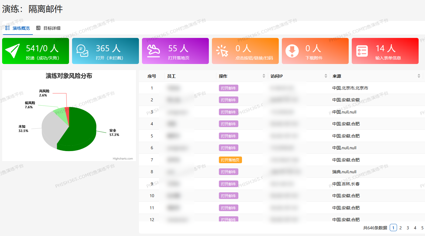 投递覆盖:平台开通于 2025 年 5 月 22 日,最大用户数 600,用户总数 541 人 ,本次演练成功投递 541 人,实现了对企业全体员工的广泛覆盖,确保演练能有效检测员工的整体安全意识水平。