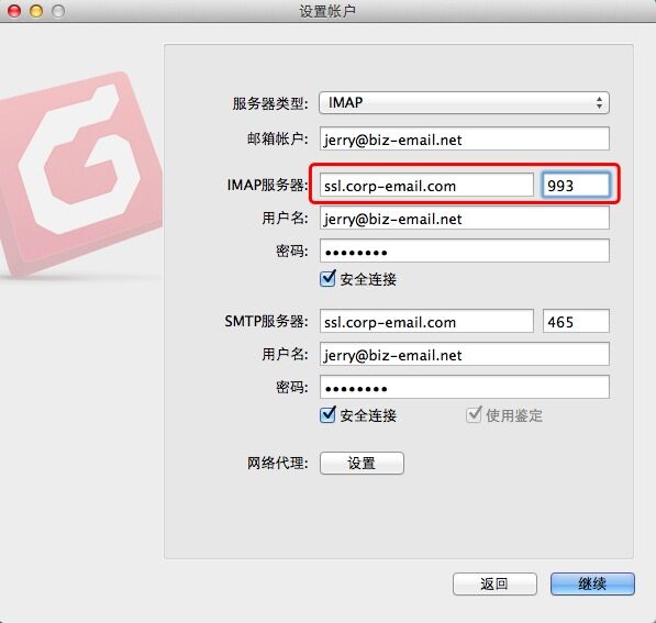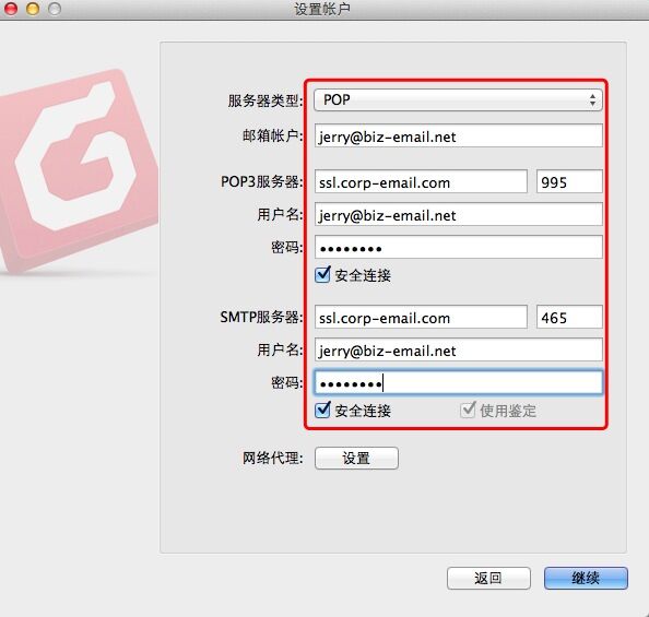 在“设置帐户”窗口中,服务器类型选择[POP];输入邮箱帐户;POP3和SMTP服务器[mail.corp-email.com]或[ssl.corp-email.com];用户名(完整的邮箱地址)和密码;并都勾选启用SSL安全连接,点击[继续]完成设置