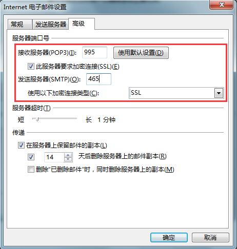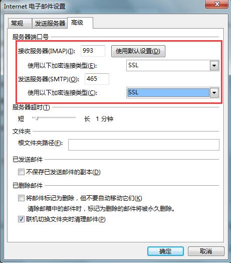 在第六步,[高级]中,选择启用SSL加密后,接收邮件端口无需修改,会自动变为993;其他设置与POP3设置一样保持不变
