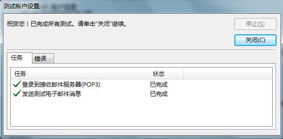 点击[下一步],系统会自动测试帐户设置,成功后显示界面如下(如测试未通过,请返回核对设置);最后点击[完成]即可完成设置